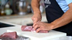 - Use pork tenderloin ends for the stuffing, and save center cut for later use (the center cut may be vacuum-sealed and cooked along with the stuffed chicken logs. Cut pork ends into thick slices, and veal scallops into 3 portions. To clean chicken livers, remove any remaining membranes and blood spots left.