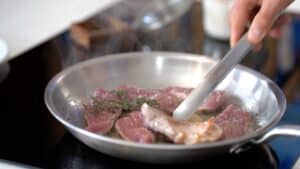 - While searing meats snd chicken livers, season with the salt and pepper that are in the ingredients list. In a large skillet, melt butter and sear the pork first on both sides for 2 minutes on medium high heat. Add a couple of thyme sprigs and a bay leaf if desired. Transfer the seared pork to a plate leaving fat in. Do likewise with veal scallops but 30 seconds on each side.