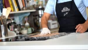 - Moisturize your countertop with a barely wet sponge, and lay over a couple of large sheets of plastic wrap. Arrange boned chicken legs skin side down on the cling film making sure there is no gaps left behind.
