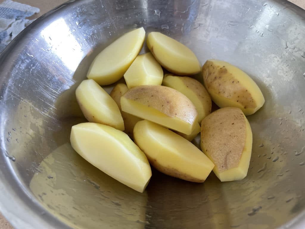 - Scrub potatoes and remove the eyes. Cut potatoes in four quarters; lengthwise. For better looking, turn each potato angles into an oval shape. Reserve potatoes in cool water to prevent from browning.