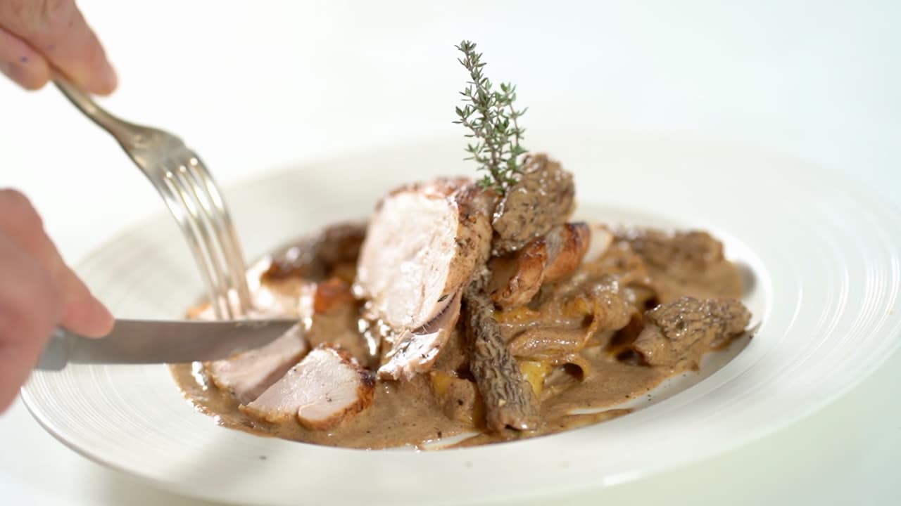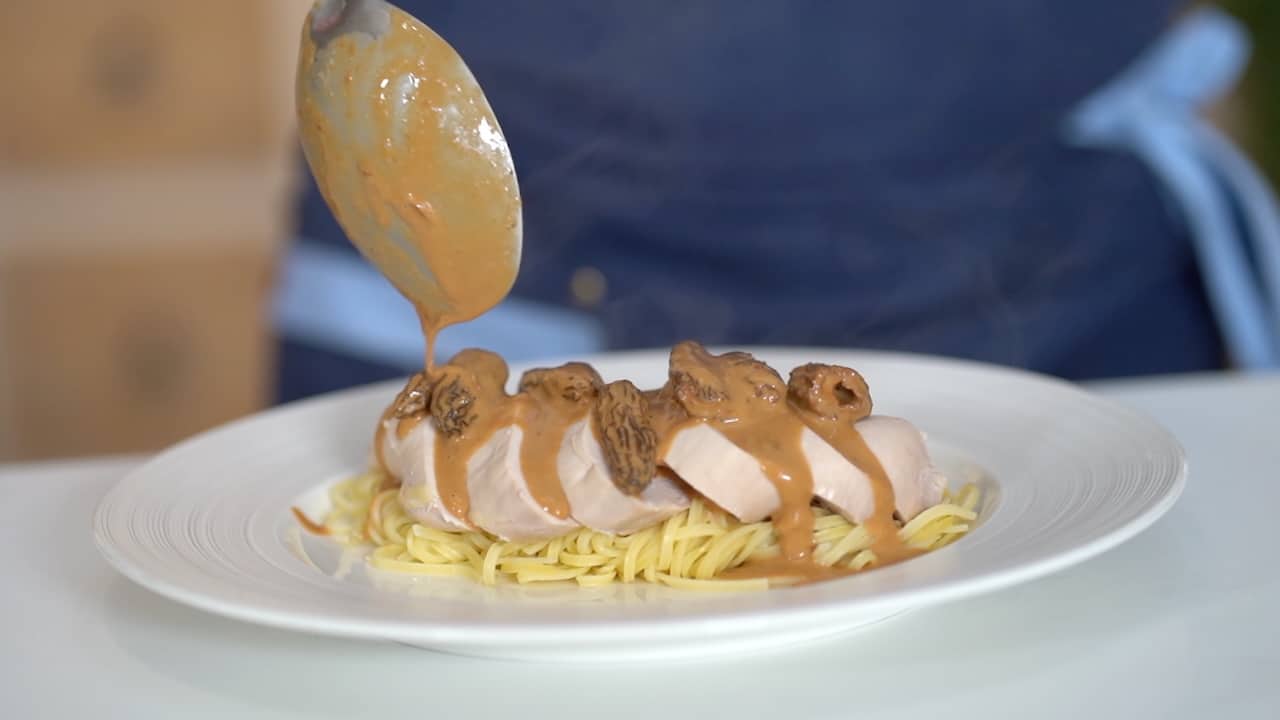 • Top pasta with the sliced chicken and drizzle with additional morel sauce.