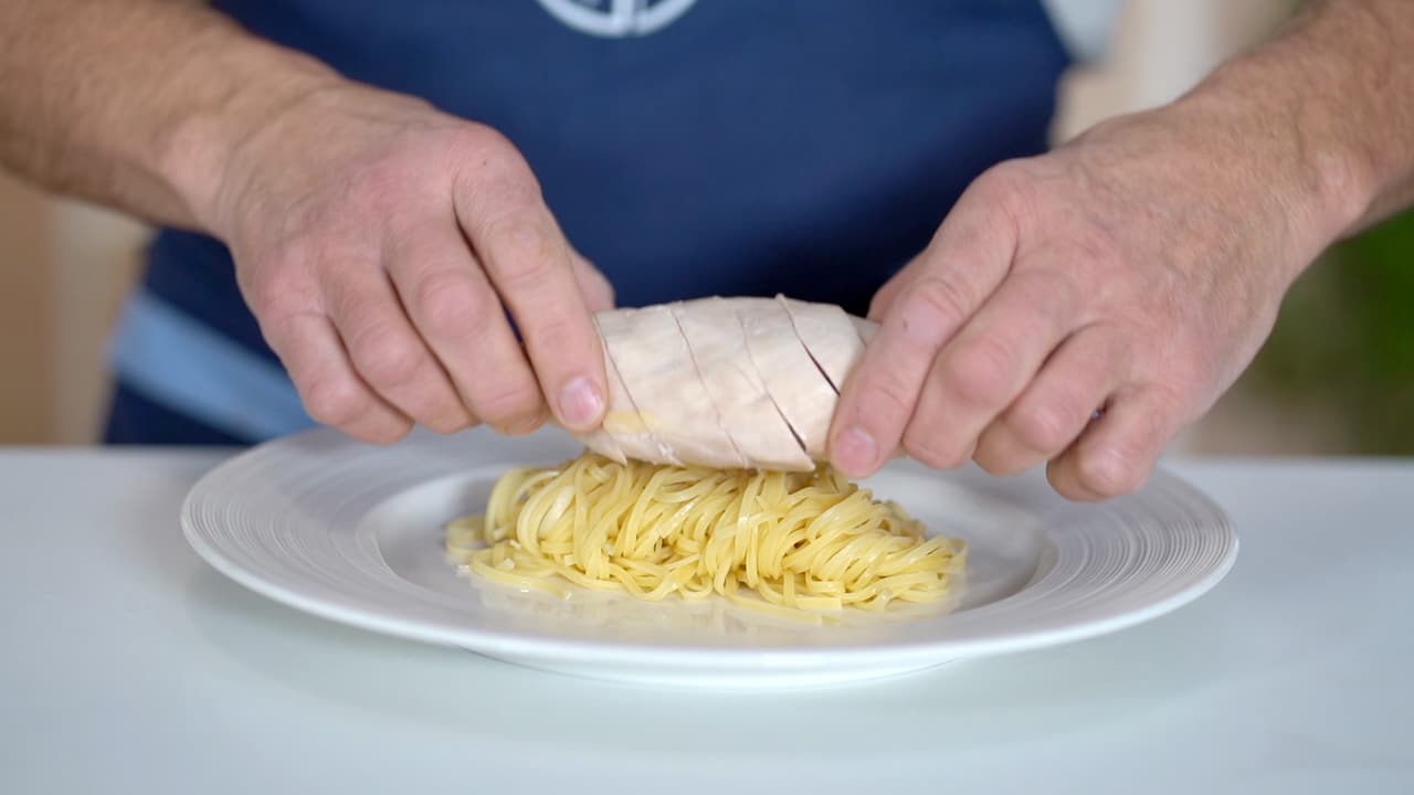 • Top hot pasta with the poached chicken breast.