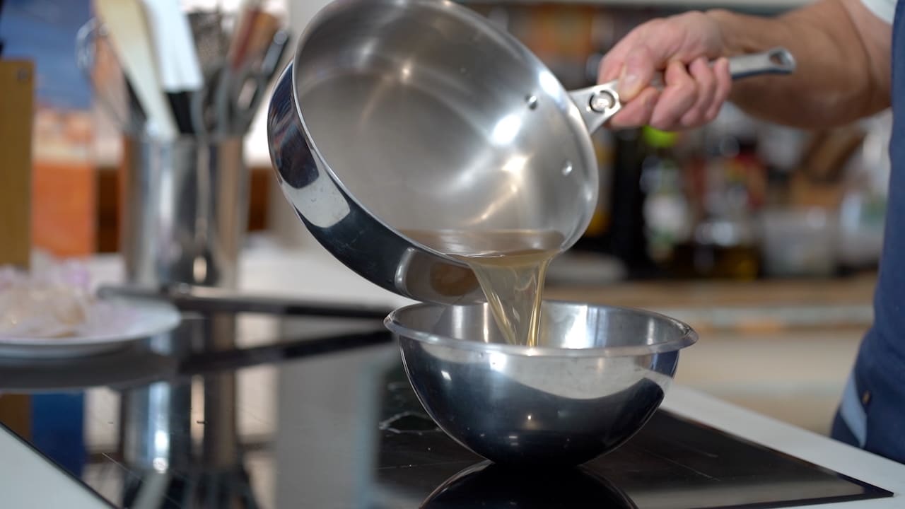 • Transfer the meat to a plate to rest. Reserve the poaching liquid for use in your morel sauce.