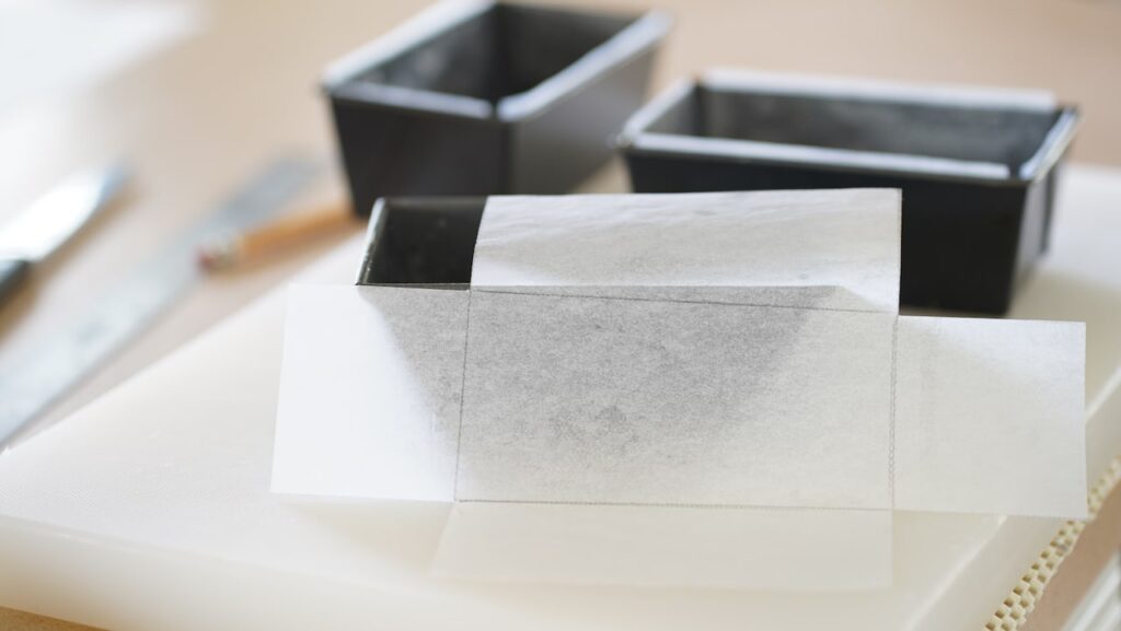 - To prepare loaf pans, grease with cooking spray and line with parchment. Grease again the inside and wipe off excess fat and refrigerated pans until ready to use.