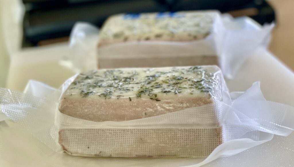 - Silicone molds, glass jars and ramekins can be used to cook pate sous-vide. Fill up molds and top with toasted pain de mie (optional and only if chicken liver parfait is flipped once cooked and chilled). Freeze pâté overnight prior to vacuum-sealing. Note that when using silicone mold, you may need to turn off the vacuum sealer machine right before the mold flexes too much. Fill an appropriate container with water, and set up your circulator to 154.4ºF/68ºC. Immerse sealed bag in the hot water and cook for 1 hour and 45 minutes. Remove from water and transfer pate to ice water and freeze for 12 hours before removing chicken liver parfait from the mold.