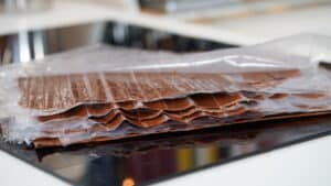- With a rolling pin, gently roll the chocolate from left to right, spreading it into a thin, even sheet approximately one millimeter thick. The goal is to create super-thin, rustic decorations.