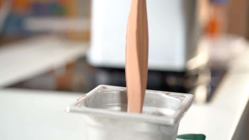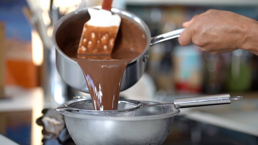 - Pass the chocolate gelato mixture through a sieve over the frozen bowl. Cool on a ice bath. Place the gelato in the refrigerator to mature for at least 4 hours, or 24hrs max.