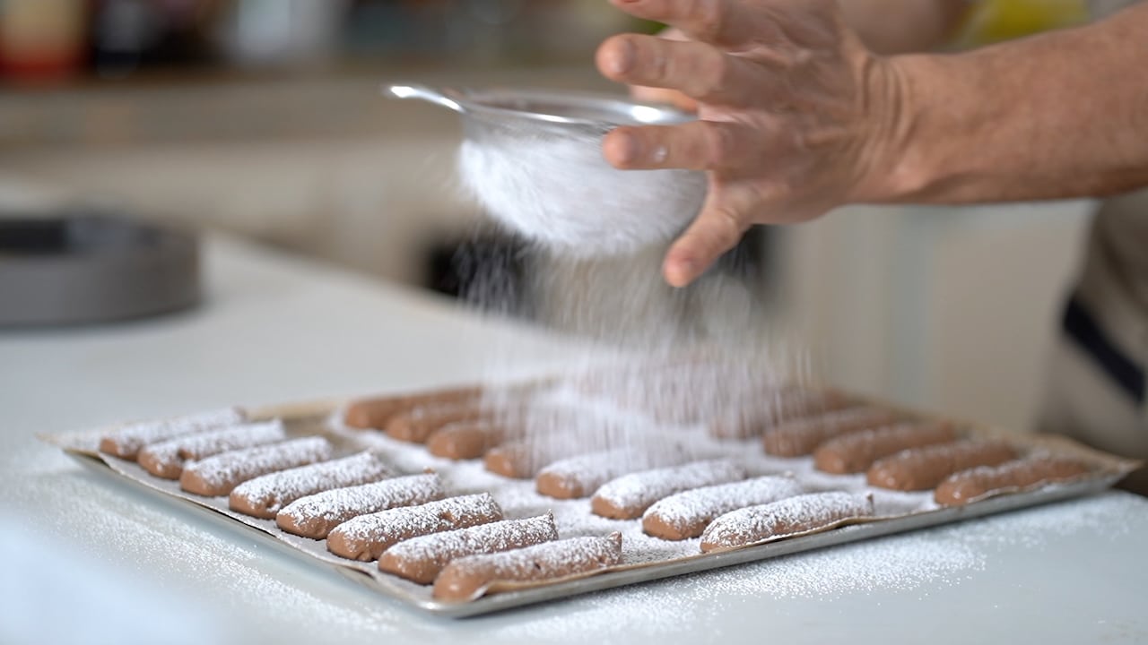 - Dust powdered sugar over the ladyfingers, but not the disks. Wait a few minutes and repeat. The icing sugar allows the ladyfingers to puff more, forming light cracks on the surface.