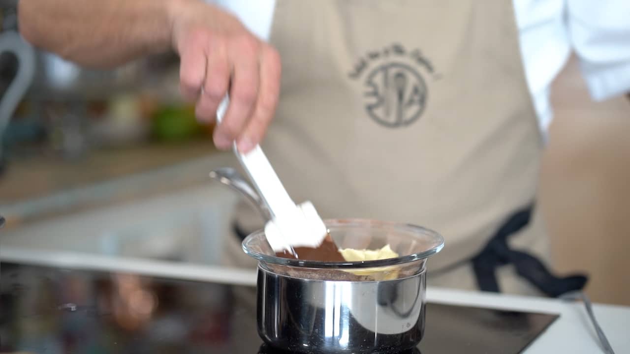- Meanwhile, gently melt the chocolate in a double boiler. Once melted, add the butter and stir until smooth. Remove from the heat and keep warm, maintaining a temperature of around 35-40°C (95°F). Preheat fan oven to 330ºF/160ºC.