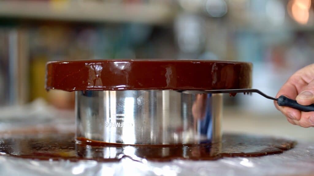 • Quickly, remove excess glaze with the help of a large offset spatula, from 6 o'clock to noon and noon to 6.