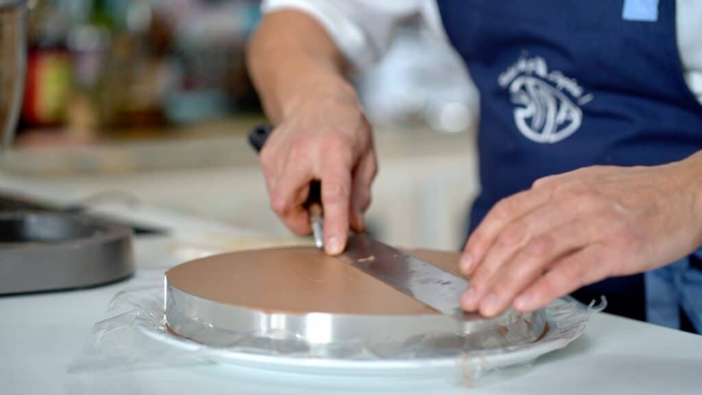 - In French pastry, “chablonner” means applying a thin layer of chocolate—usually with a brush—over a sponge or biscuit base (like in an Opéra Cake). This chocolate layer acts as a protective seal that consolidates the base, prevents it from breaking, and stops moisture from compromising its texture. Melt 50g dark chocolate, stir in about 10% neutral oil. Coat the whole surface of the Dacquoise bottom only, and chill to set.