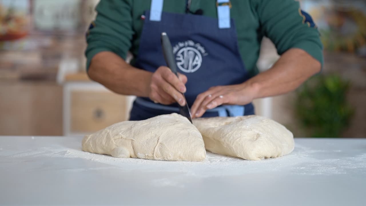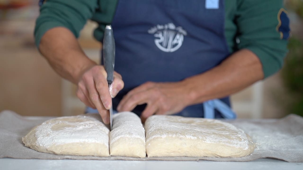 - Divide the dough slab into 6 baguettes. Lightly dust with flour between each cut.