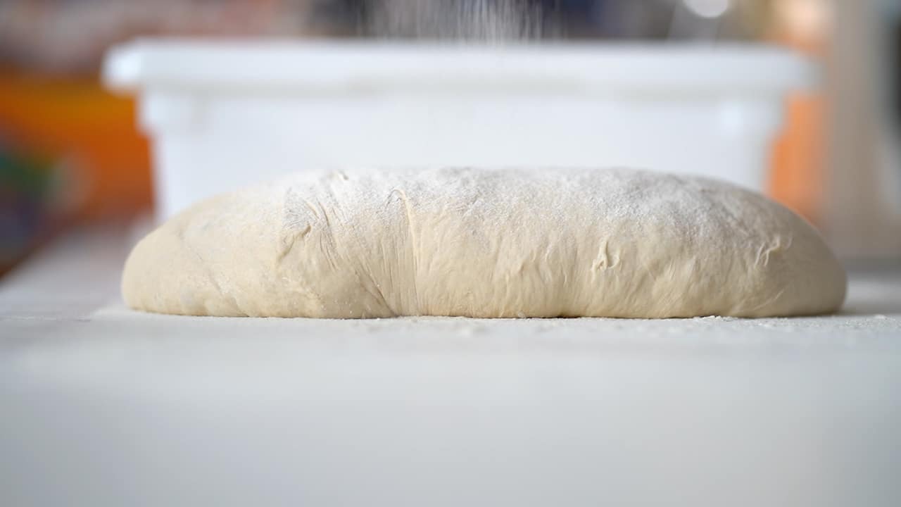 - Gently deflate it by giving it a few quick pats all over (skin side down). The goal is to release the larger bubbles that have formed here and there while keeping the smaller bubbles intact. Be careful not to smash the dough—the millions of tiny bubbles are the result of a properly executed bulk fermentation. Using as little extra flour as possible, fold it to form a fat oval slab.