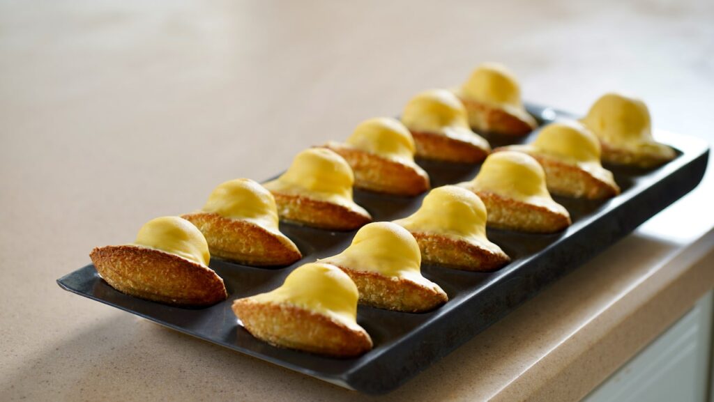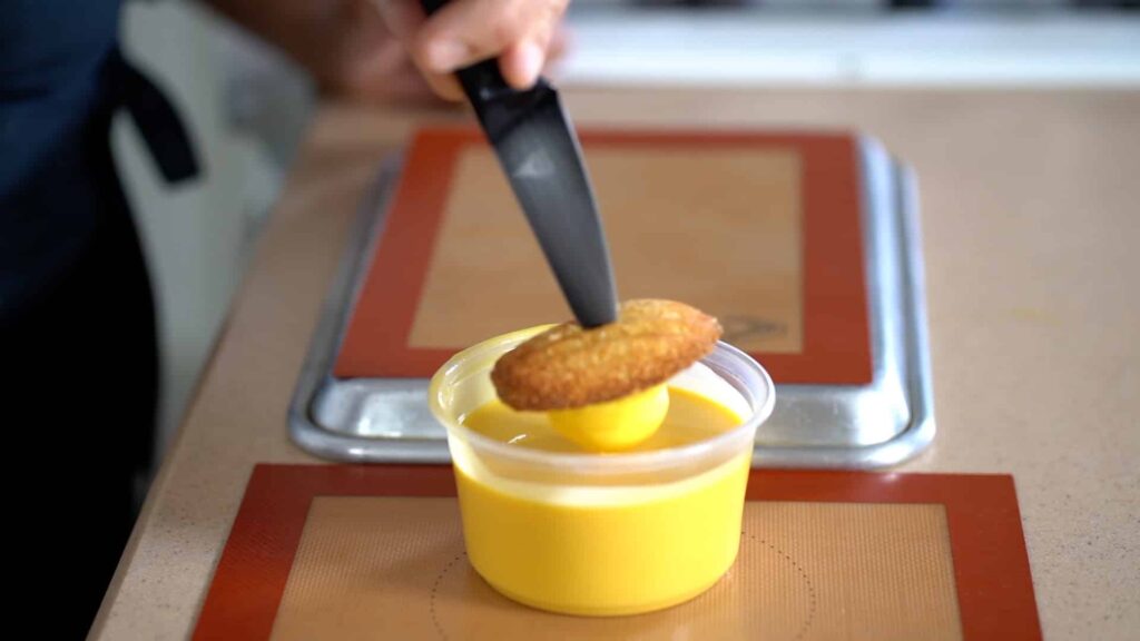 Coconut Macaroons, also known as "gâteau congolais" or "rochers à la noix de coco" in French are classic French cookies. One of the key highlights of this traditional treat is the luxurious touch of tempered dark chocolate glazing one side of the cookie, adding a rich and decadent element to the overall experience. The combination of coconut and dark chocolate creates a perfect balance between sweetness and bitterness, making each bite a moment of pure bliss. ut Macaroons, where every bite tells a story of French culinary tradition and passion for exquisite flavors. And the bonus? Madeleine En Trompe l'Oeil. A coconut macaroon base cookies and a hump made out of passion fruit crémeux.