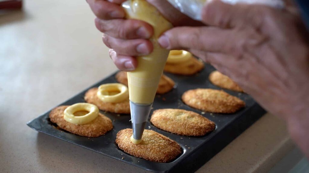 - Mix dry ingredients first, then add glucose, vanilla and eggs. Grease madeleine sheet with cooking spray. Scoop out 30g/1oz portions and press down on sheet – use plastic to ease it. Remove plastic wrap, and reshape cookies edges. Let macaroons to dry out a couple of hours on the counter. If you want to make coconut rochers instead, leave cookies out all night before baking. It creates a thin crust that strengthens the outer shell of cookies.