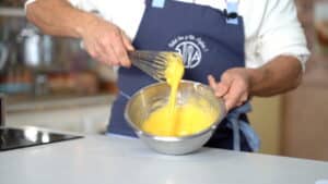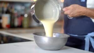 - Bring the infused milk to a boil. Gradually whisk about one-third of it into the egg-sugar mixture.