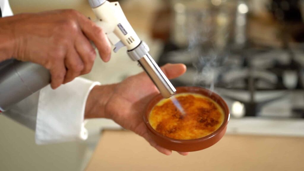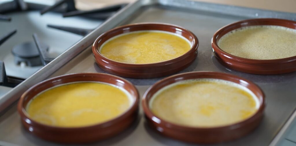 • Conventional oven: bake at 325ºF/160ºC for about 35 minutes until set. Convection oven: creme brûlée can be cooked without hot water at 275ºF/135ºC. Transfer creme brûlée to a clean baking tray and allow to cool completely before refrigeration.