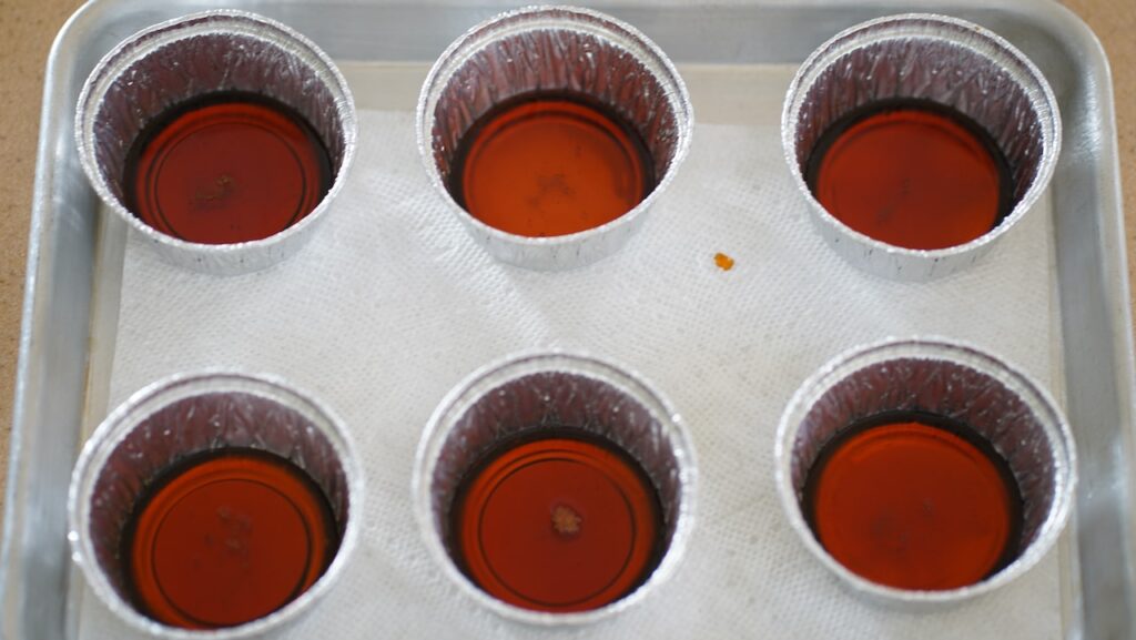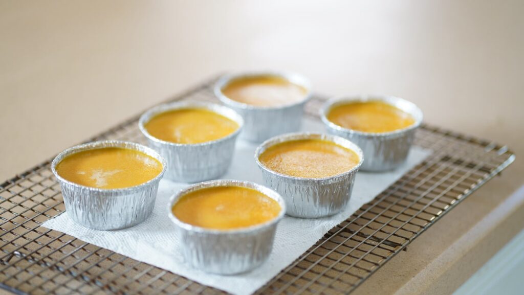 - Bake at 265ºF/120ºC for about 50 minutes. Lower temperature to 250ºF/120ºC if using a convection oven. Transfer creme caramel to a clean tray to cool.