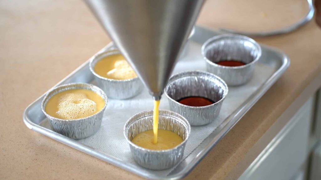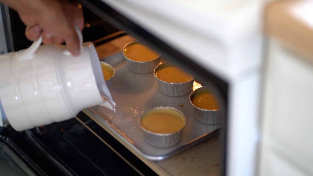- Carefully place the baking tray on the oven rack, pour boiling water into the baking tray or dish taking care not to splash water into the custard, until water reached two-third height of the cups.