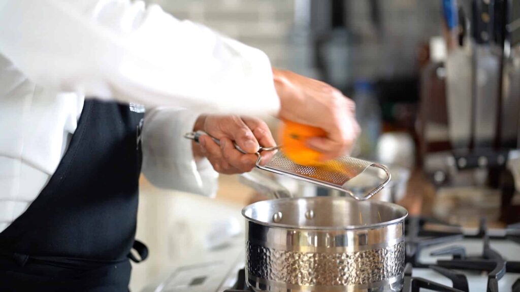 - Bring to a boil heavy cream, milk and orange zest. Cover and let infuse for a few minutes. Meanwhile, beat together whole eggs, egg yolks and sugar. Slowly add hot liquid into the egg-sugar mixture; mix well.