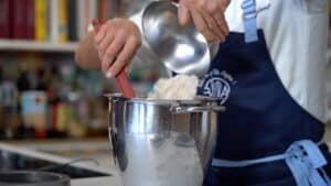 - Set mixer to high speed and beat egg whites to firm peaks adding remaining sugar gradually. Stop mixer, and fold the hazelnut-almond mixture in the meringue.