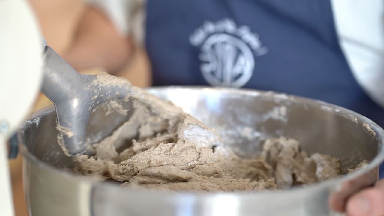 - Add the flour, and mix on low speed for about 2 minutes, until just combined. Add the natural starter and the fermented dough. Mix on low speed for 10-12 minutes, stopping to scrape down the sides of the bowl as needed. The dough will be very sticky, so use wet hands and wet tools when handling or scraping it. After mixing, the dough should reach a temperature of approximately 90-95°F (30-35°C).