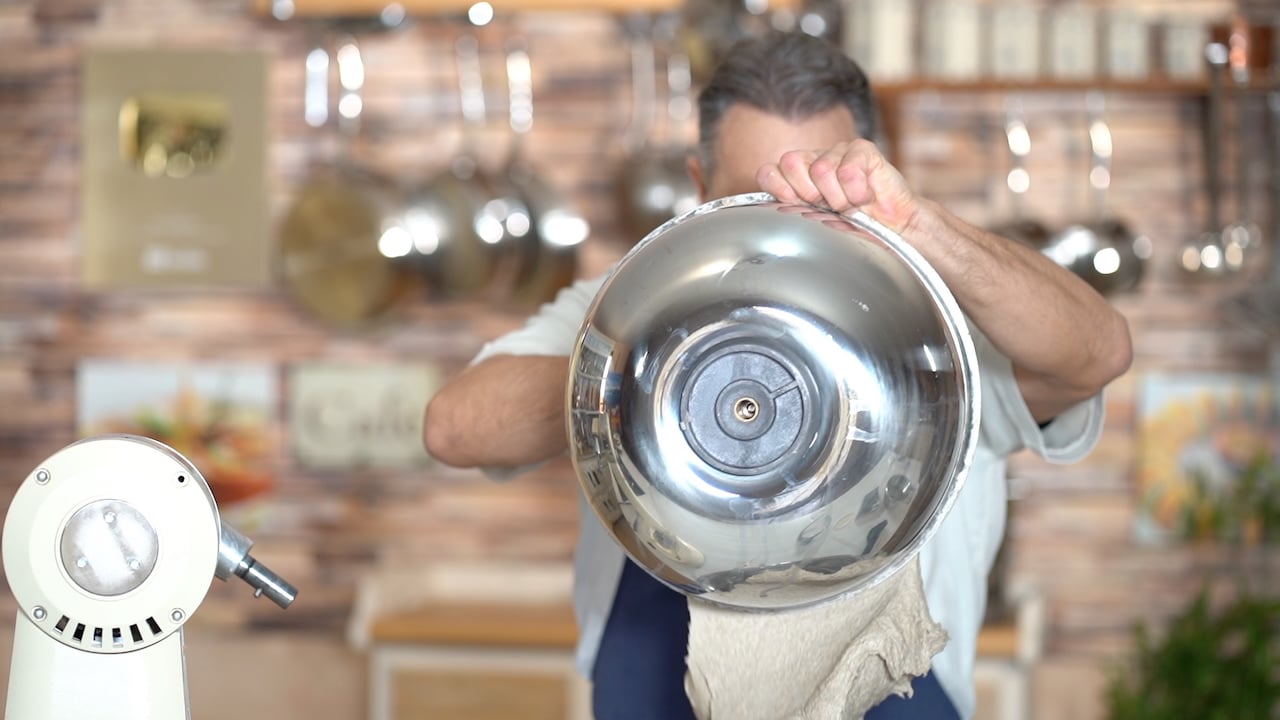 - Wet your hands and dough scraper with water. Transfer the sticky dough in the large bowl. Smooth out the surface of the dough with a wet dough scraper.
