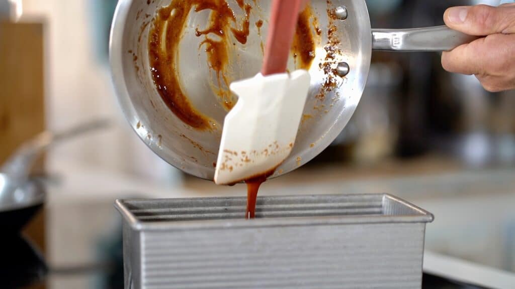 - Grease the loaf pan with cooking spray. Pour the hot caramel into the loaf pan; set aside.