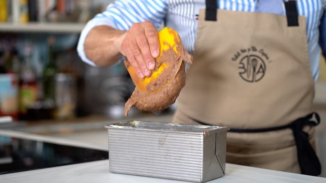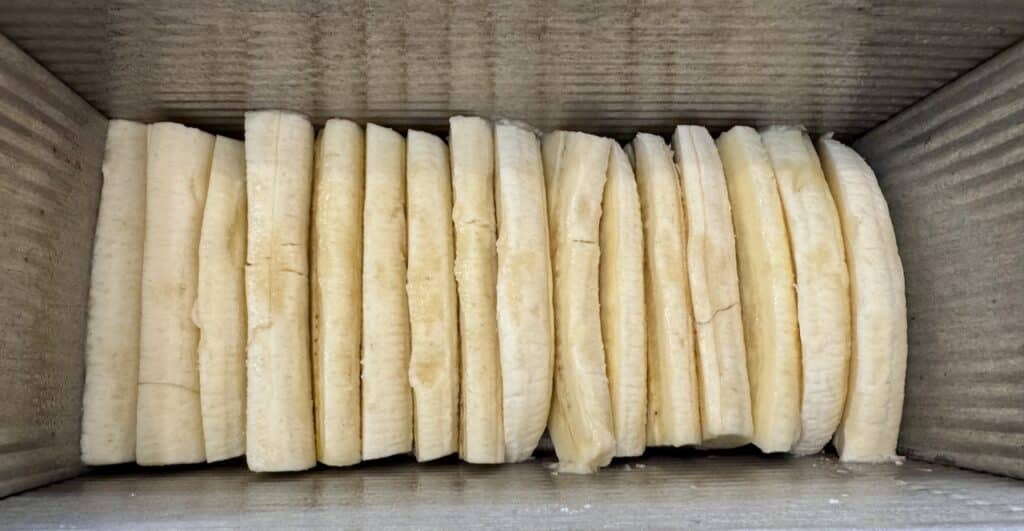 - Arrange banana sidewise in the mold on top of the caramel. Pre-cook bananas for 20 minutes. Turn the oven off. Let cool completely, and place the loaf in the refrigerator.