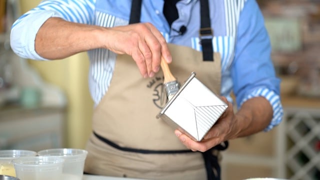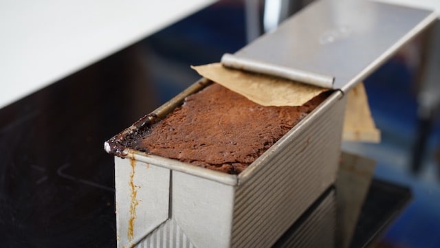 - Fill the loaf pan with all of the batter. Add a piece of greased parchment on top and insert the lid in.