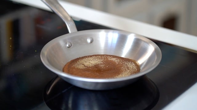 - Heat raw sugar with vanilla powder until it melts and turns light amber. Lower the heat and add butter. Stir well until fat is fully incorporated.