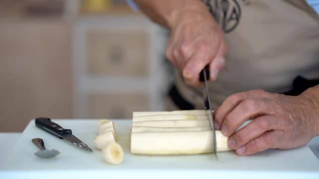 - Peel bananas. Cut them into 3¾-inch logs, and then lengthwise. Preheat fan oven to 330ºF/160ºC. (Save scraps for the banana puree).