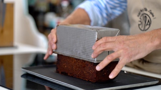 - Preheat fan oven back to 330ºF/160ºC. Bake chocolate banana bread for 70 minutes. Remove the lid and parchment. Let cake cool 10 minutes. Place a baking tray on top and flip it. Do not de-mold yet!. Let stand at room temperature for 2 hours and refrigerate cake overnight.