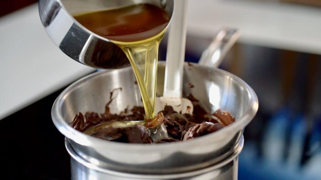 - In a small saucepan, melt cocoa butter alone on low heat. Meanwhile, begin to melt dark chocolate over a bain-marie (the simmering water should not touch the bowl). Pour the melted cocoa butter in the dark chocolate.
