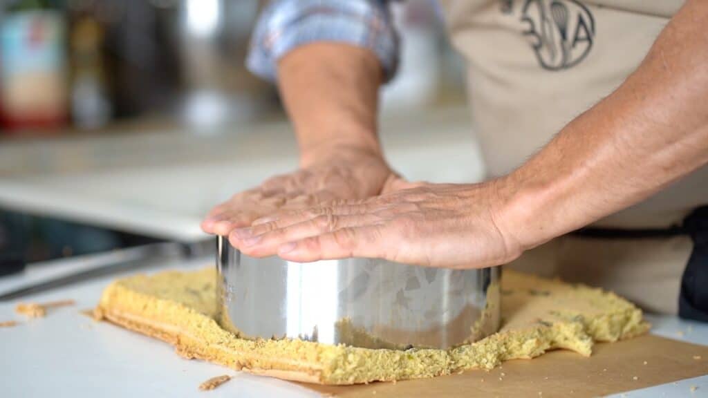 - Top with the frozen crunchy-pistachio-biscuit insert (crunchy up), and gently press down.