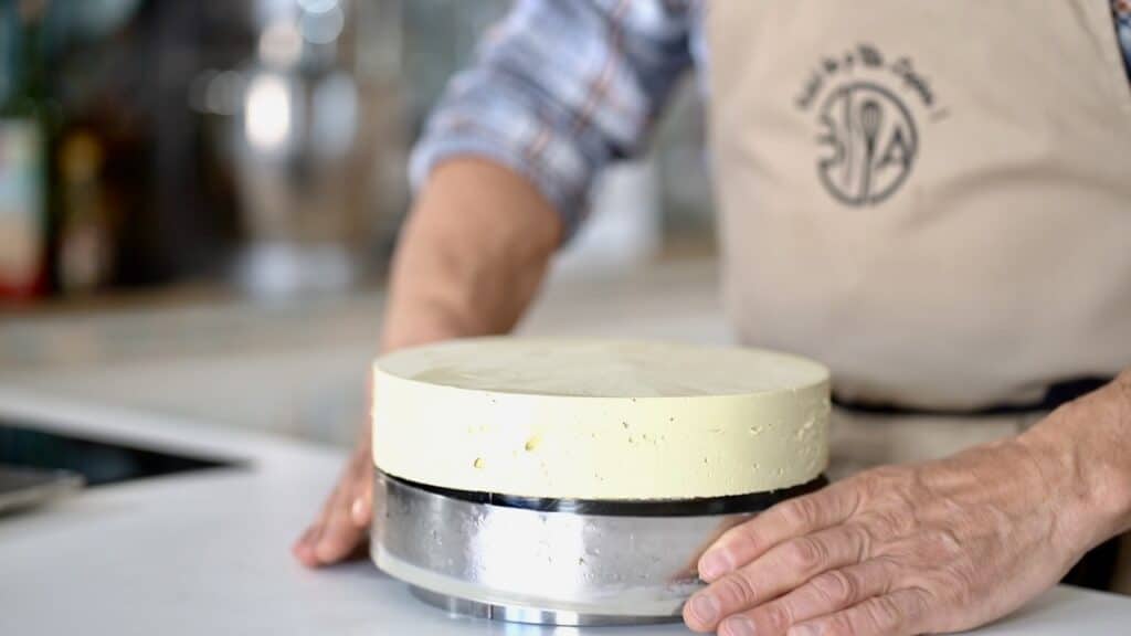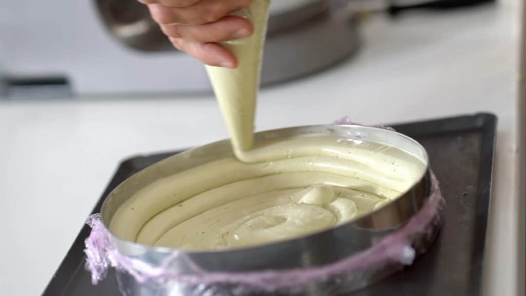- Fill cake ring ½ full, and pipe out more mousse around the borders. Then smooth out the edges with the back of a tablespoon.
