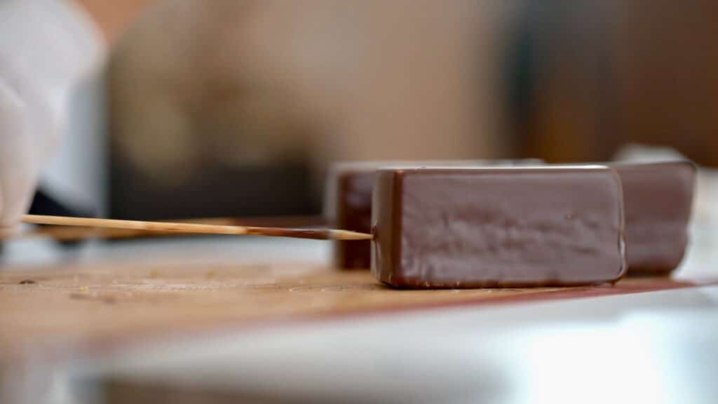 - In order to create the snaps that we are all familiar with, each Dubai cake slice is going to be dipped into the chocolate enrobage. To hold the frozen cake slice downward, insert the tip of a bamboo skewer in the back sturdily (do one cake at the time leaving remaining cakes in the freezer). Dip cake in chocolate in the rotating motion. Pull out and hold a few seconds until the chocolate shell begins to set.