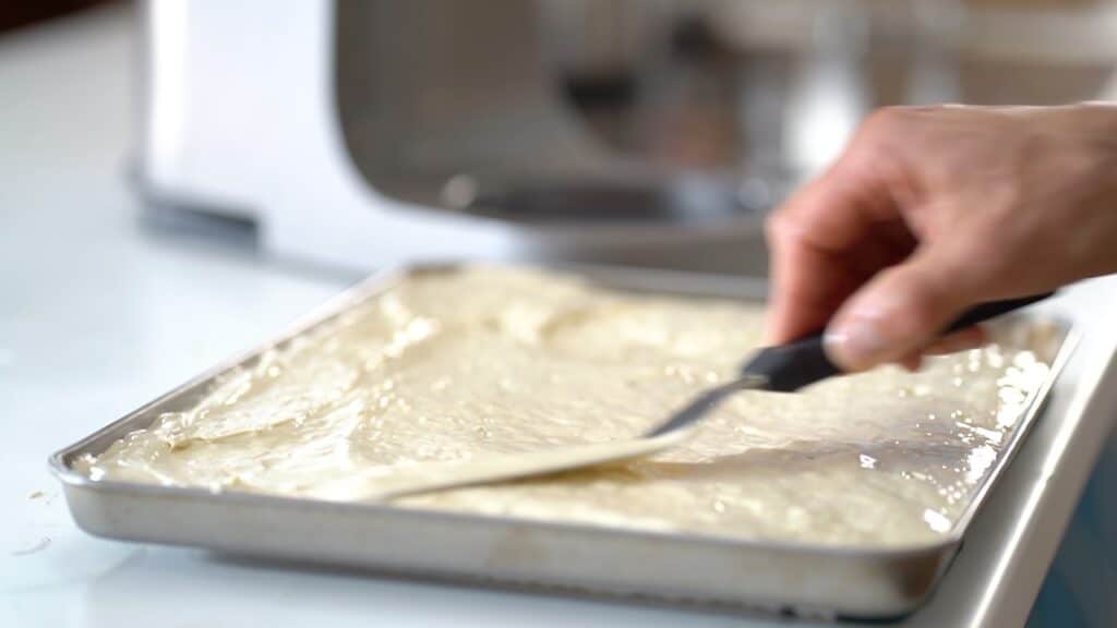 - Preheat fan oven to 330ºF/160ºC. Spread the pistachio batter in the greased rimmed baking tray lined with parchment. It can also be achieved using 2 baking pans.