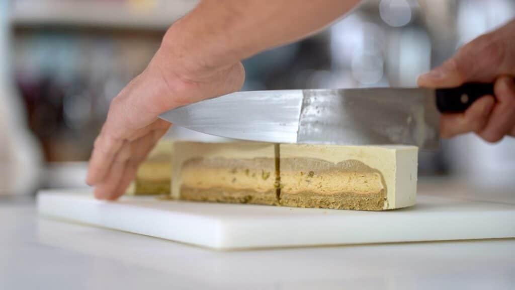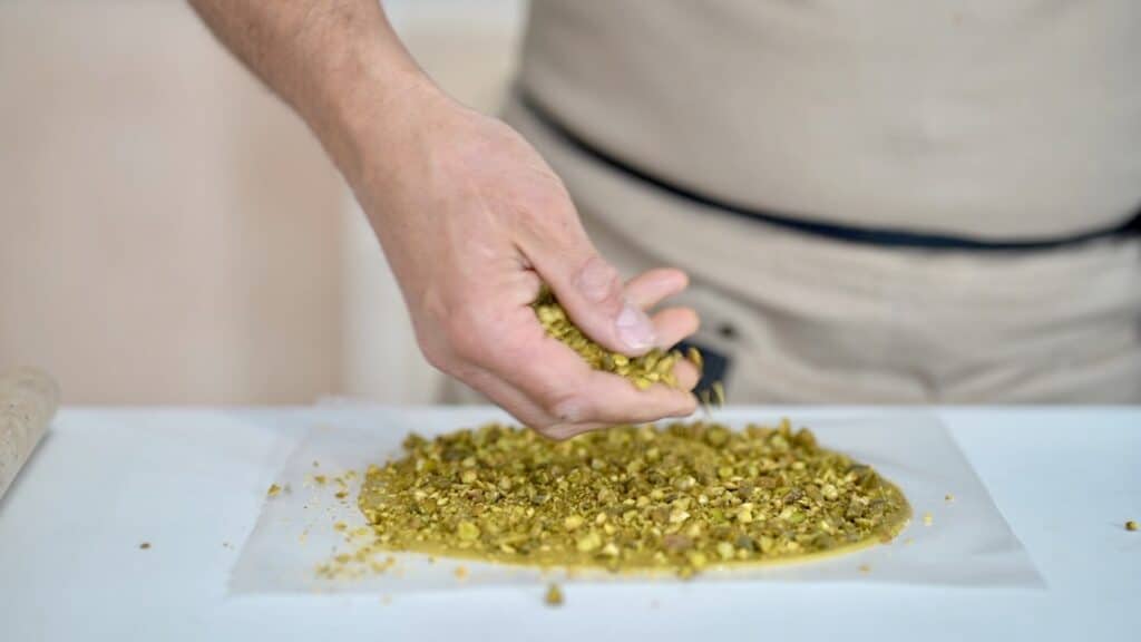 - Cut frozen pistachio brittle into an 8-inch/20cm diameter disk. Cut it into 10 or 12 triangles; keep them in the freezer.