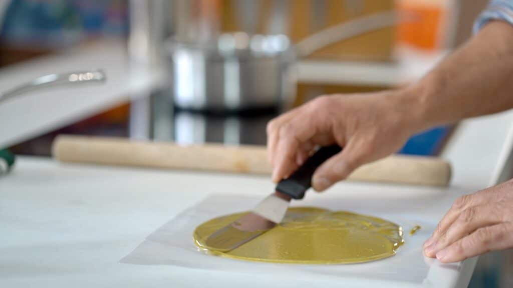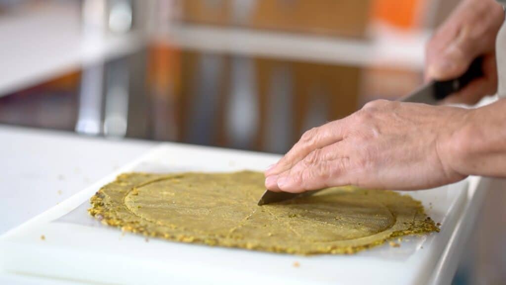 - Melt white chocolate to 95ºF/35ºC, and combine with the room temperature pistachio butter. Spread into an 8-inch/20cm disk (use a sheet of plastic acetate or sous-vide bag.