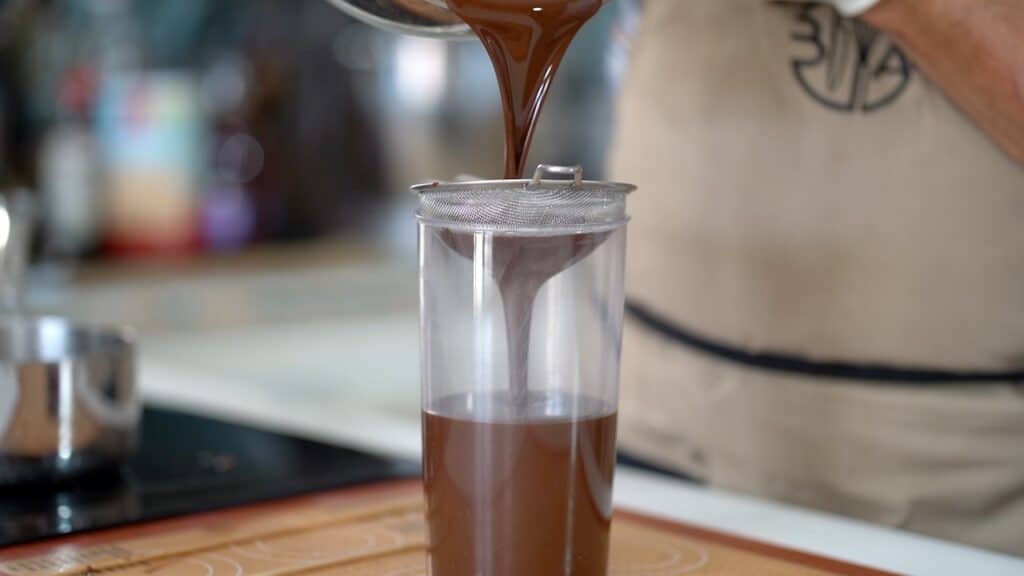 - When the chocolate-cocoa butter mixture reaches 113ºF/45-50ºC max, pass through a sieve. Use chocolate enrobage at 95ºF/35ºC on hard frozen cakes.