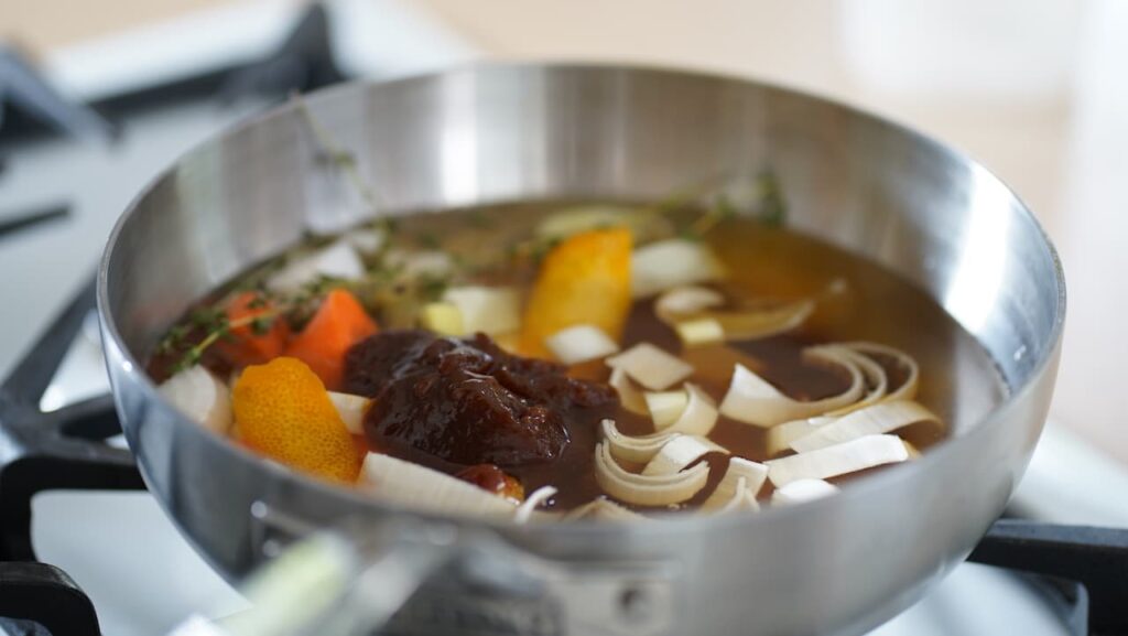 - Chicken or Veal Demi-Glace can be used for the sauce. If so, mix 150g demi-glace with 750g water. Otherwise use low sodium stock. To create duck confit with glaze, mix together demi-glace with water or use low-sodium chicken stock. Add carrots, leeks, onions, garlic, mushroom stems, herbs and a couple of peppercorns. Bring to a boil and then lower the heat to simmer. The goal is to reduce it by half, which should take about an hour. Add rendered duck jus and continue to simmer. Meanwhile, reduce the port by two-thirds so it is syrupy. Remove stock from heat and pour through a sieve to eliminate solids. Pour the liquid into the reduced port and stir to mix. Season with salt and pepper, then let simmer for another 20 minutes. Taste the sauce and reduce further if needed.