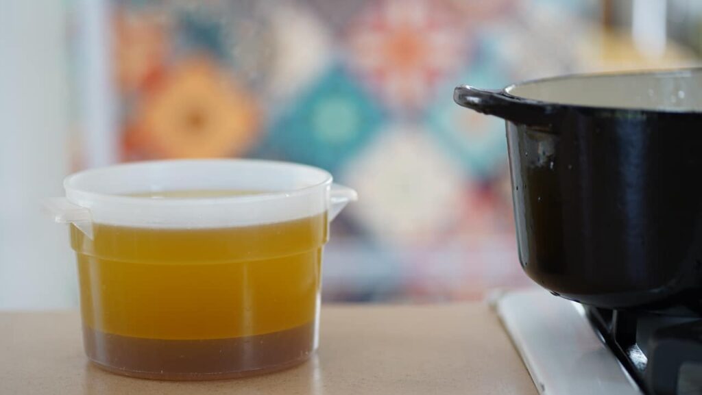 - Now, you'll find a layer of rendered duck jus underneath the duck fat. This jus is a concentrated liquid filled with flavor and collagen, making it a valuable ingredient for the sauce.