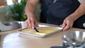 - Spread batter onto a 9X13-inch/23X33cm baking tray lined with greased parchment paper, or baking mat. The thickness of the biscuit shall not exceed 0.75-inch/2 cm in height. Almond biscuit can also be baked in a buttered and floured cake pan.
