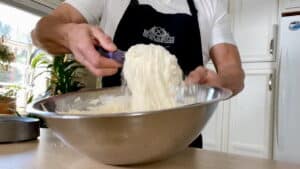 - Separately, sift flour and baking powder; set aside. Stop mixer and swap the paddle with the whisk attachment. Continue to whip the almond mixture adding the remaining eggs gradually, on medium speed. Increase mixer speed to high, and beat 8 minutes until light and fluffy.