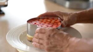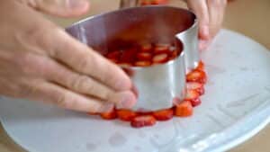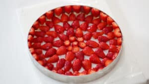 - Back to the montage: Pipe a layer of mousseline to cover the fruits without reaching the edges. Arrange strawberry halves next to each other downward (tip down) against the ring.
