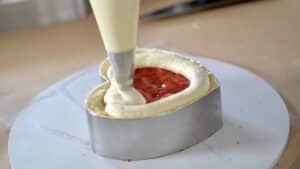 - Spread some strawberry marmalade, and freeze cake for 15 minutes. Pipe more filling to cover the entire space. Even out using the offset spatula.