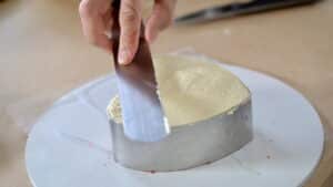 - Pipe about an inch/3cm buttercream filling all over the surface of the cake. With an offset spatula, press filling upward following the curves of the mold.