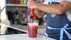 - Transfer the chilled strawberry mixture to a narrow container, add raspberry liquor and smooth out using an immersion blender.