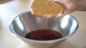 - Moisten almond biscuit in the raspberry punch, flip it and let stand for a minute or so.